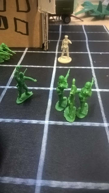 So i wa messing about with kids i made a simple war game months back - this time we made zombies vs army game. I was zombie vs 3 boys who eventually after my initial luck spree got to use their movement and range to win. Next time i get a din0saur or more spawning rolls. Still was good for an hour of play